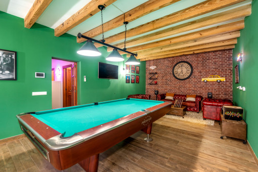 The basement area is extremely spacious with the same mirrored surface as the first floor and is also beautifully finished. Starting with a bar, pool billiard room with table football and lounge, as well as a well-equipped gym and a separate large office. Also with various exits to the outside area.