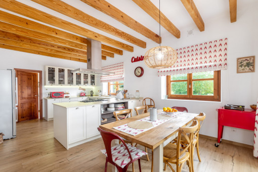 On the first floor, you are greeted by a beautiful entrance area. This leads you to the left into the large, comfortable kitchen with dining area and adjoining laundry room with its own exit. Straight ahead from the entrance area is the large living room, also with a long table, pellet stove and, of course, underfloor heating throughout the house.