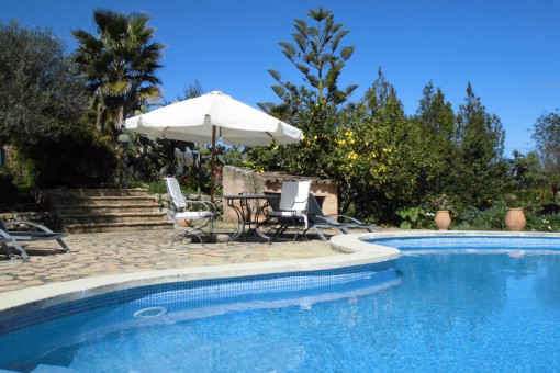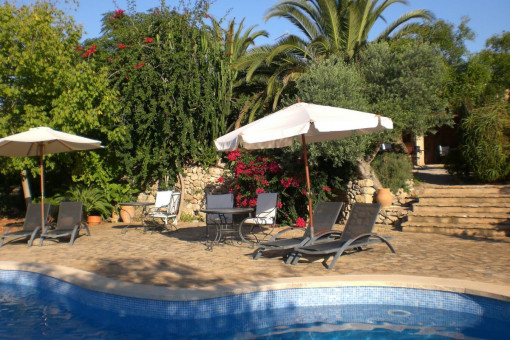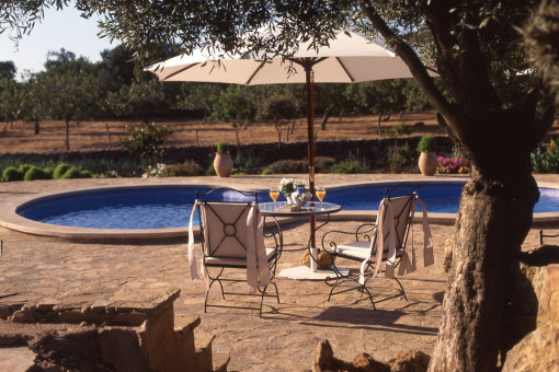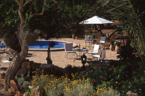 Outside, the property invites you to relax: shaded seating areas, a gently curved pool surrounded by natural stone terraces, Mediterranean plants and quiet corners beneath mature trees create a garden full of peace and charm.