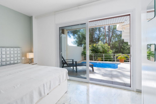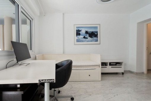On the lower floor, there is a private suite with bedroom, bathroom, and office. From here, you reach the partly covered sun terrace with a private pool. A spiral staircase also connects the terrace with the upper balcony.
