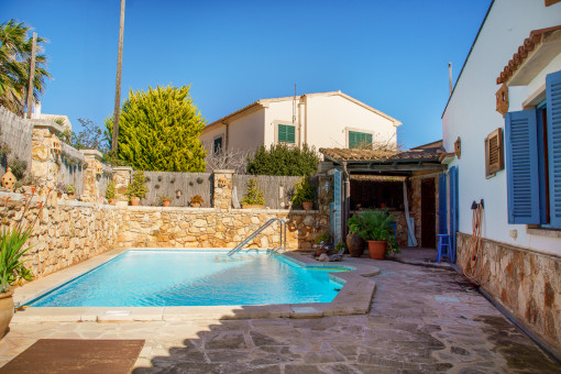 The typical Majorcan architecture predominates, with palm trees, hibiscus and almond trees in the gardens. Light-coloured stone walls form the boundary and on the stone terraces cats doze under the shady crowns of the umbrella pines.