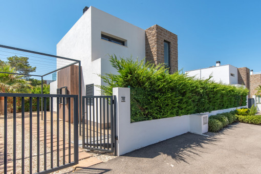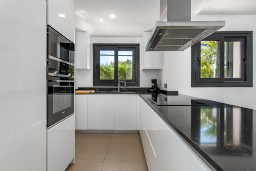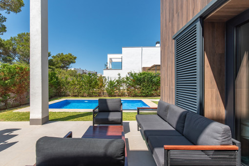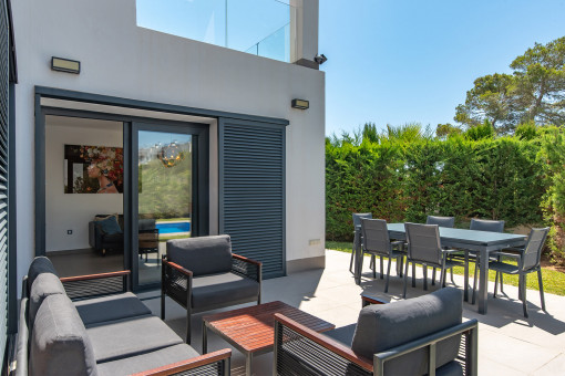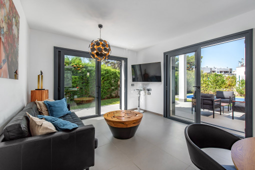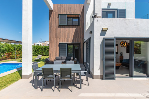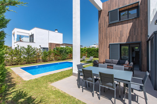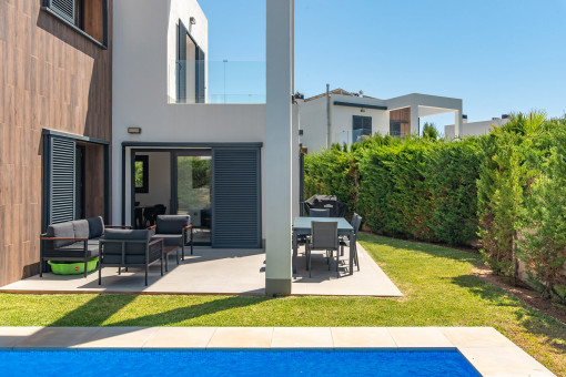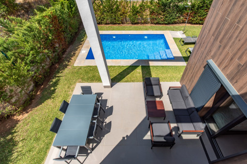 When you enter this villa, you feel captivated by the open and bright living concept. Large floor-to-ceiling windows allow plenty of light into the house and you immediately feel at home. To the left is the open kitchen with an adjoining utility room. To the right is a bedroom, a bathroom and access to the spacious cellar. A large rainwater cistern is installed here, which ensures the central irrigation of the garden and the cellar also offers plenty of additional storage space. The open-plan living and dining area round off the first floor. From here you can also access the well-tended garden with its large private pool. A covered terrace is part of the outdoor area, providing a shady spot on sunny days.
