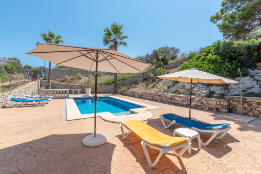 The lowest level houses the private sleeping area with three bedrooms, another bathroom and a practical utility room. From here, you can step straight out to the pool area – a peaceful, sunny space with open views. The pool measures approx. 32 sqm and is surrounded by spacious terraces.