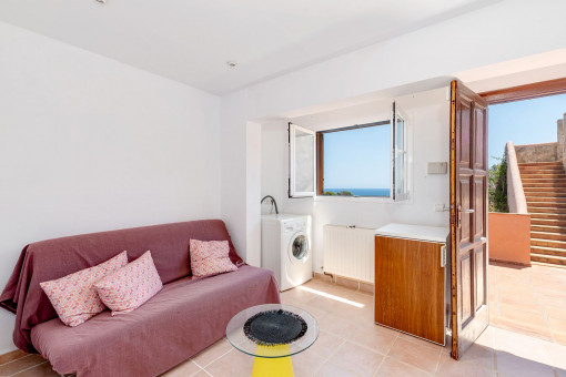 The entrance is via the uppermost level, where you'll find the garage. Adjacent to it is a discreet and easily accessible technical room. One level below is the separate guest apartment with two bedrooms, a cosy living room, a bathroom with new shower and a private terrace – perfect for hosting friends or offering privacy for guests.
