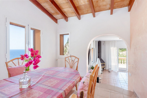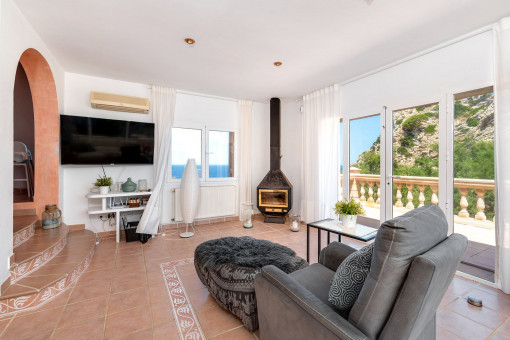 The main living area includes a bright kitchen connected via a few steps to the open dining area. From the kitchen, a staircase also leads directly to the front terrace on the level of the living room. One level down is the lounge with fireplace, floor-to-ceiling windows and access to a terrace with breathtaking sea views. A bathroom is also located on this level.