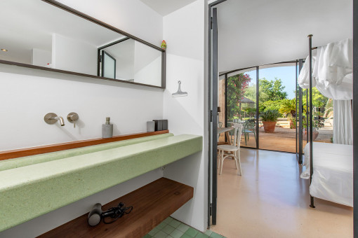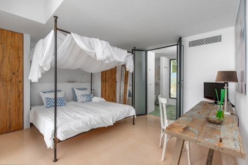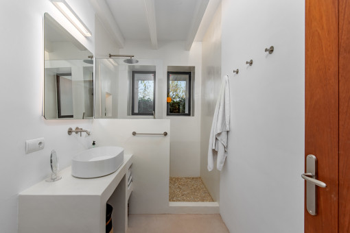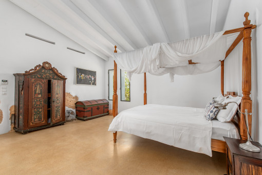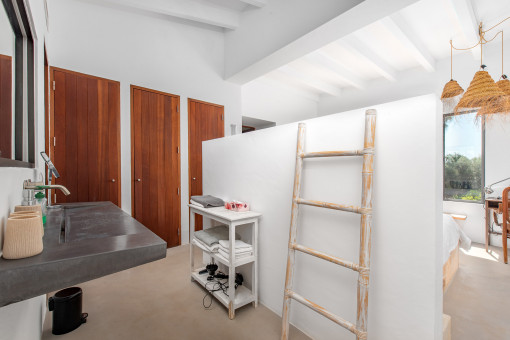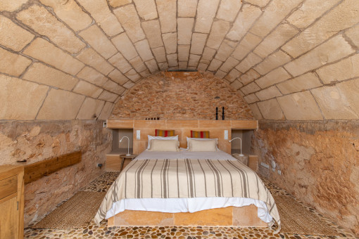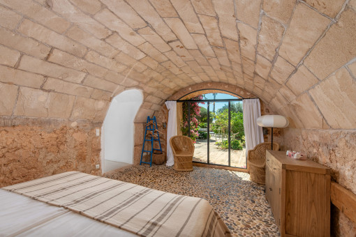 The separate guest house also offers the highest level of living comfort: a cozy living area with fireplace and a bedroom on the first floor with natural stone vaults and floor-to-ceiling windows create a special atmosphere. There are three further bedrooms and two bathrooms (one of which is en suite) on the upper floor. Here too, each bedroom is equipped with air conditioning.