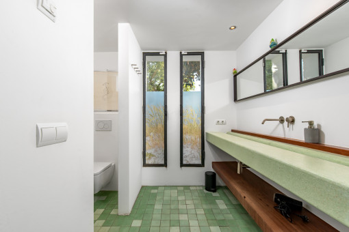 The property consists of a charming main house and a separate guest house. In the main house, you are greeted by a spacious loft-style living and dining area with high ceilings and a fireplace. The elegant, open kitchen blends in harmoniously and invites you to cook together. There is also a bedroom with en-suite bathroom and a guest WC on the first floor. On the upper floor there is another spacious bedroom with its own bathroom. Underfloor heating and air conditioning ensure a pleasant living climate all year round.