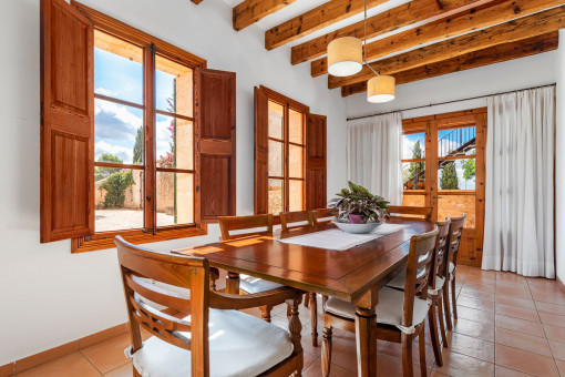 Upon entering this light-filled finca, the generous layout immediately catches the eye. The property offers four bedrooms, one of them with an en-suite bathroom. The warm contrast between the honey-coloured wooden beams and the white walls creates an elegant and welcoming atmosphere.