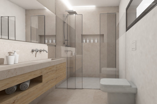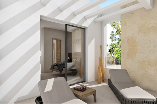 There are two further bedrooms on the upper floor, each with an en-suite bathroom. From one of the two bedrooms, the master bedroom, you also have access to a private terrace. A lovely chill-out area can be created here.