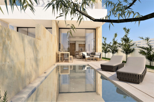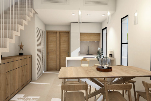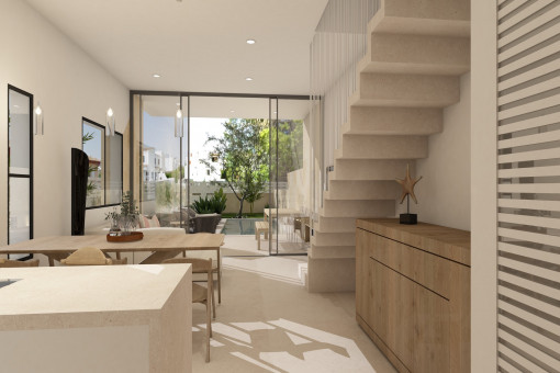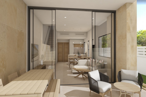 The semi-detached house will have a constructed area of approx. 172 sqm. Particularly noteworthy is the well thought-out floor plan, which allows for optimal use of space and offers you plenty of design freedom. Inside, you can expect a stylish interior with high-quality tiled floors that create a timeless ambience. The living area is bright and inviting. It flows seamlessly into the inviting dining area with integrated kitchen. Large sliding glass doors create an almost seamless transition to the covered terrace. A bedroom and a bathroom are also located on the first floor. From the bedroom, you also have direct access to the rear garden.