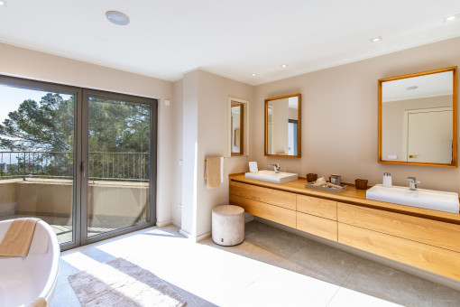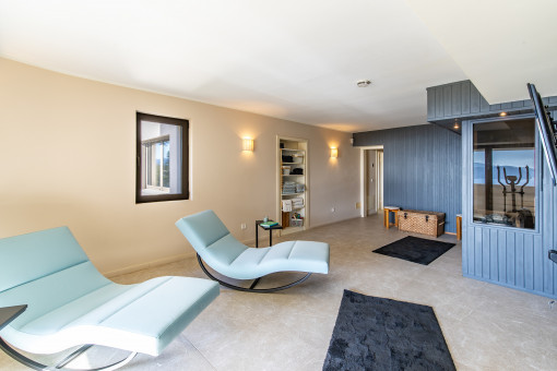The villa features 5 elegant bedrooms, each with its own bathroom, a custom American kitchen with an adjoining open living room, a sauna and fitness area with a bathroom and cold plunge pool, a guest toilet, a laundry room, numerous storage rooms, and a double garage.