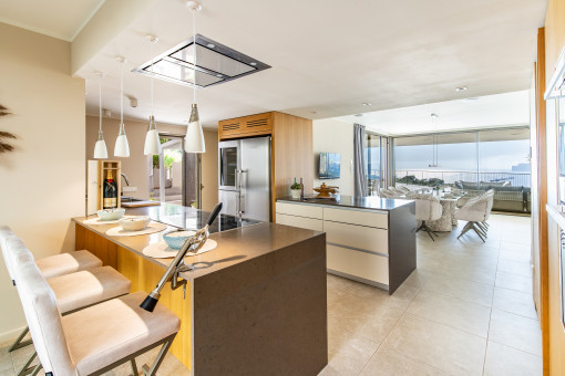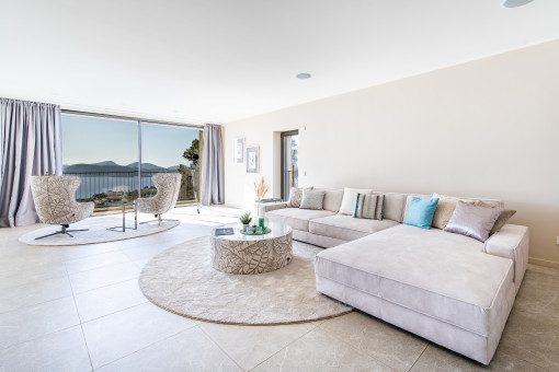 From the very first step through the stunning entrance, you are transported into a world of luxury and elegance. Upon entering, you are greeted by a breathtaking panoramic view of the endless expanse of the sparkling sea. The large windows allow light to flood in, creating a harmonious connection between the indoor and outdoor areas.