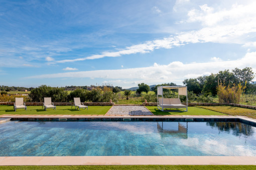 A particular highlight is the separate wellness and leisure area with indoor pool, sauna, fitness room and additional flexible spaces, making the finca attractive throughout the year. The outdoor area features a large swimming pool, several terraces and a covered barbecue area with its own toilet. The landscaped Mediterranean garden enhances the private character of the property.