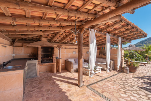 A large swimming pool with sun terrace and outdoor kitchen provides the perfect setting for parties and socializing with family and friends. There is also a small garden shed, which is currently used as a machine room and storage room.