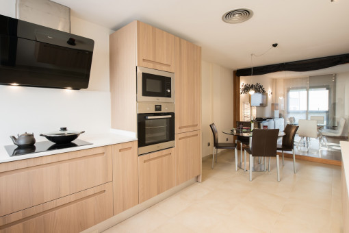 With a constructed living area of 129 sqm, the apartment offers a well-thought-out and functional layout. It includes an entrance hall, a spacious living and dining area of around 40 sqm, a fully equipped kitchen with an adjoining utility room, 3 double bedrooms, and 2 bathrooms, one of them en suite. The bright, airy rooms create a pleasant living atmosphere with plenty of space.