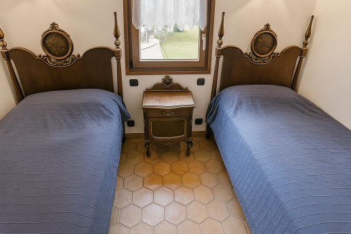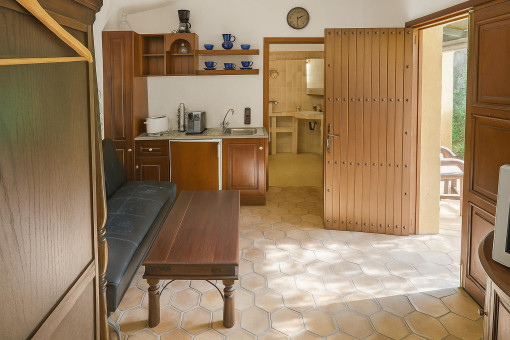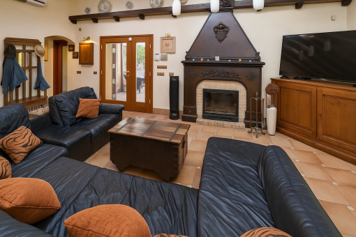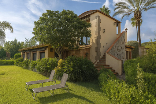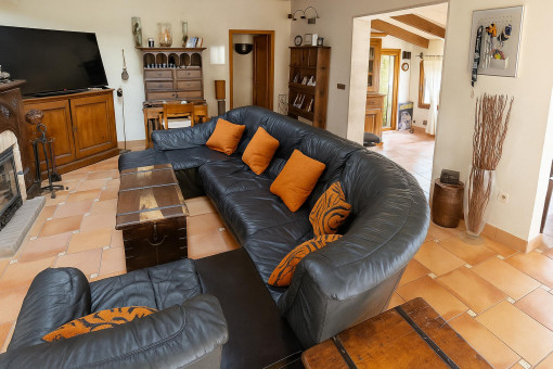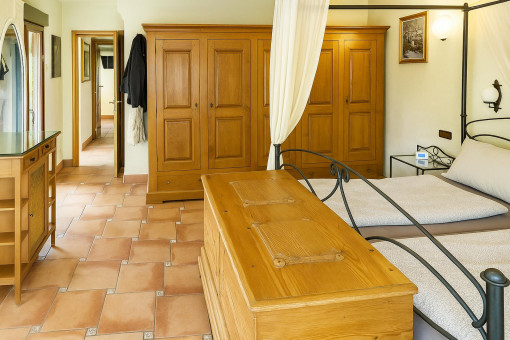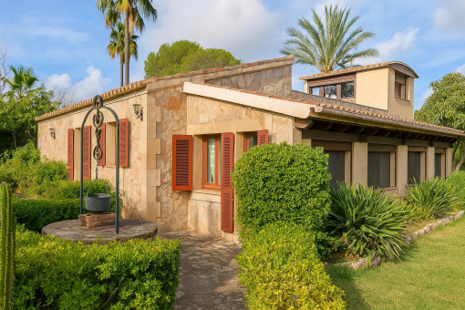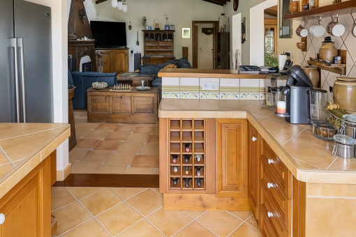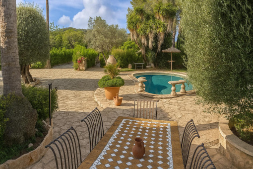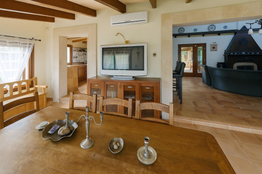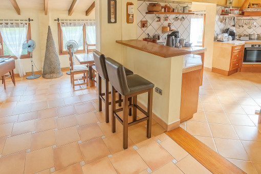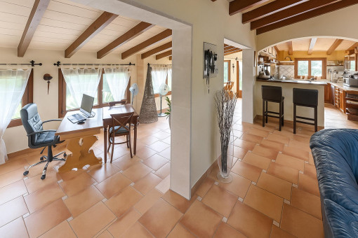 Typical Mallorcan elements such as terracotta tiles and high ceilings with wooden beams give the house its unmistakable charm.