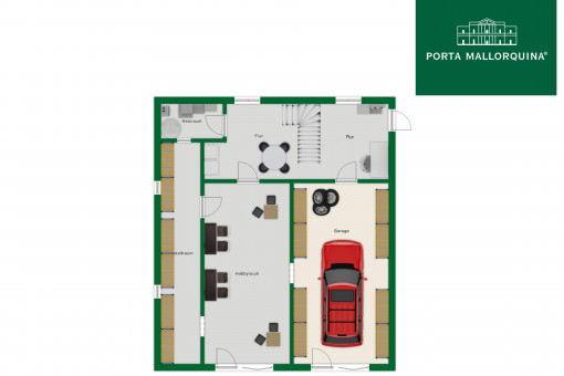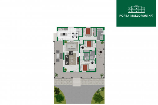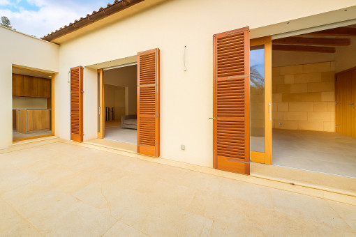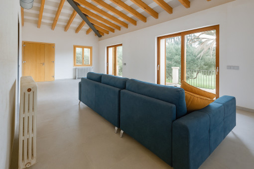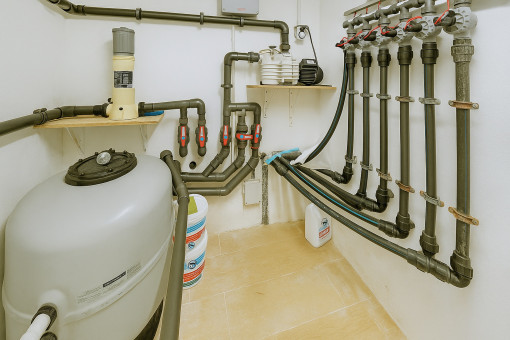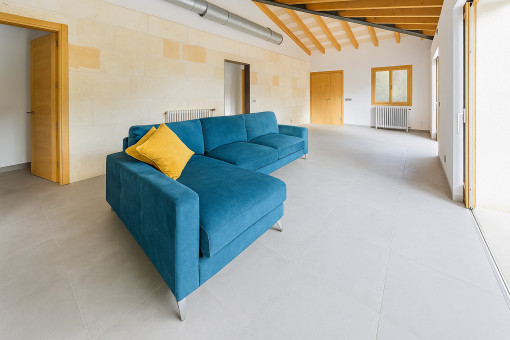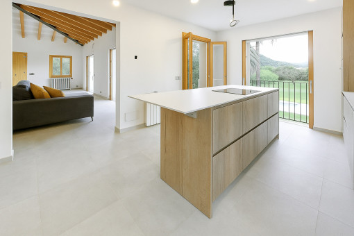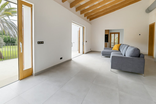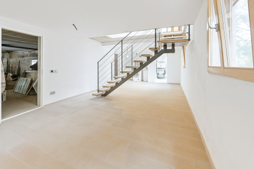 The spacious living room opens onto the large sun terrace with wonderful views of the pool and the Puig de Maria. Right next to it is the bright, inviting kitchen, from which you can access the basement. This houses 2 machine rooms as well as generous areas for individual use - whether garage, hobby room, fitness area or chill-out zone, there are no limits to the imagination here.