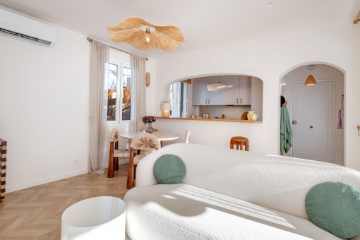 With a constructed interior area of 45 sqm, the modern-designed apartment offers two bedrooms with high-quality built-in wardrobes, one bathroom, and a bright living area with an open-plan kitchen and direct access to a 9 sqm covered terrace – perfect for relaxing outdoor moments. The high-quality renovation gives the entire apartment a fresh and contemporary living feel.