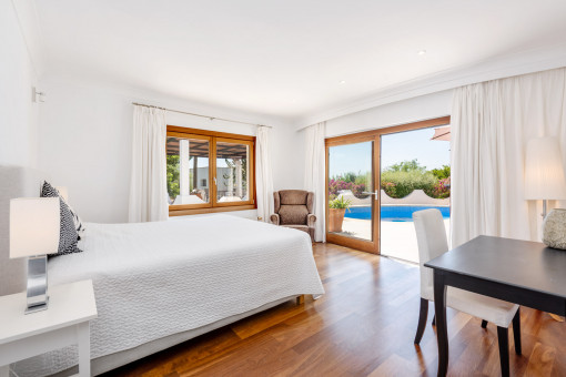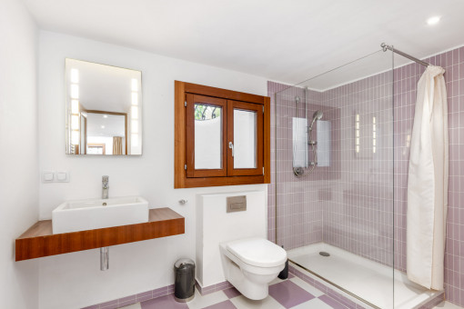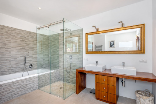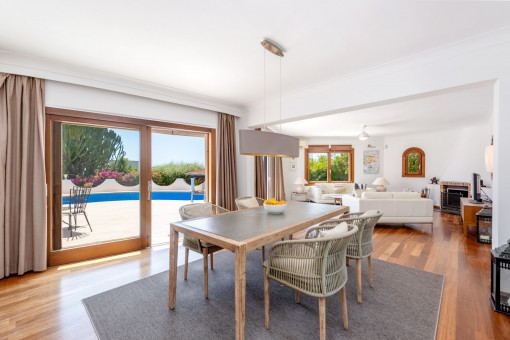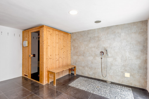 The bright 154 sqm main living area on the upper floor opens onto a spectacular approx. 28 sqm pool terrace with a pool bar and southwest orientation. Several covered terraces allow for year-round outdoor living in true Mediterranean fashion. A charming wood-burning fireplace adds warmth to the living room, while large windows flood the space with natural light and create a seamless connection to the surrounding nature. The separate kitchen is equipped with a high-quality osmosis water filtration system. Three bedrooms with built-in wardrobes and 2 bathrooms—one of them en suite—provide comfort and privacy.