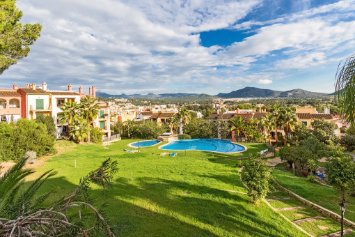 From the generous living room you have direct access to the terrace, where you can enjoy mountain views and overlook the communal areas. Central hot/cold air conditioning ensures comfort throughout the year. An outdoor communal parking space within the complex is also available. The apartment is available immediately for long-term rental.