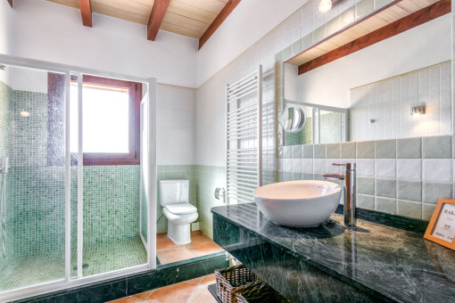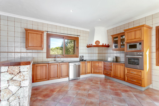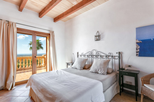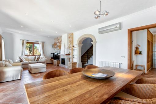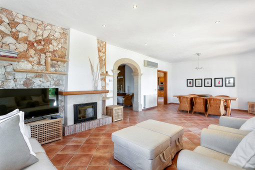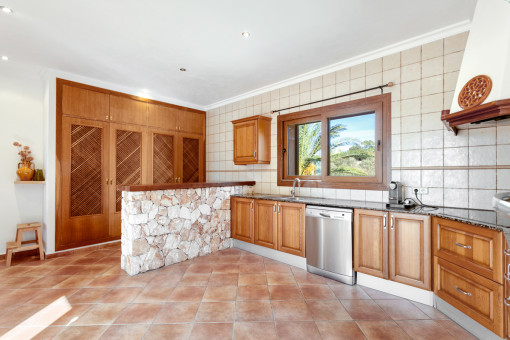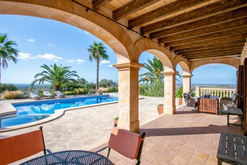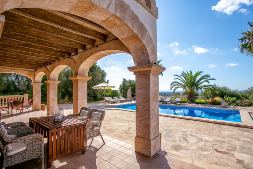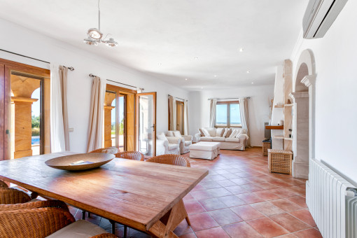 This beautiful finca is situated on a hill between S'Alquería Blanca and Santanyi. As soon as you drive through the 17,000 sqm plot to the house, a spectacular view opens up over the countryside as far as the coast and, to the south, the island of Cabrera.