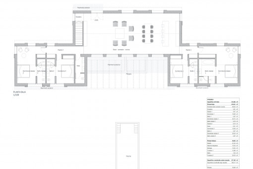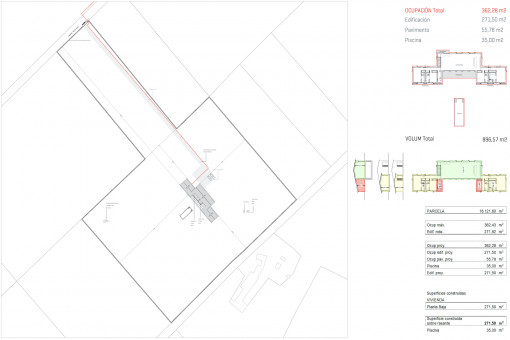 The constructed area on the first floor is 271.5 sqm. In addition, there is a terrace/pergola of almost 56 sqm and a pool (10m x 3.5m). Furthermore, the central part of the house has a basement, where approx. 96 sqm of usable space (126 sqm constructed area) will be available as a technical, storage and utility room or as a bodega or similar.
