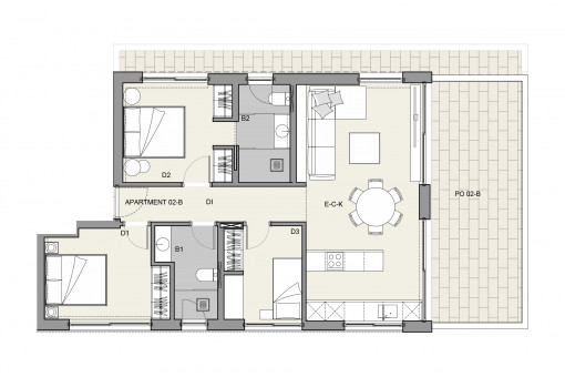 This modern apartment is located on the second floor and has 109,60 living space with two bedrooms, two bathrooms and a spacious living/dining area with American kitchen. From the living room you can access a 23.60 sqm covered terrace with southern exposure.