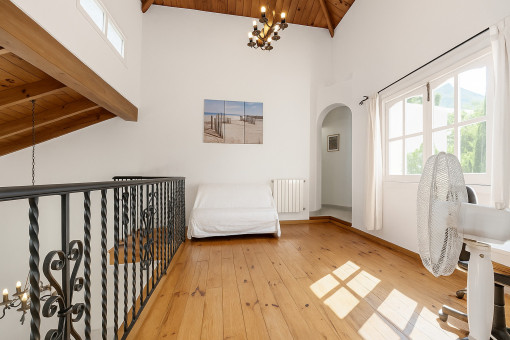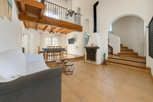 An Ibiza-style staircase with whitewashed railings leads up to the open gallery overlooking the living area. On this floor are two further bedrooms that share a modern shower bathroom.